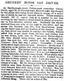 According to reports, on September 10, 1897, a drunken motor cab driver in London, England was arrested for drunk driving (DUI) after crashing his vehicle. The driver entered a guilty plea and was fined.